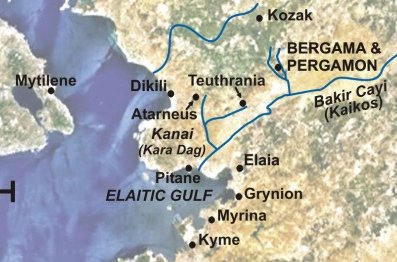 In our example, in defining the direction from which Hera brought the wind from the sea, the poet had eight choices. In addition to choosing one of the four winds from the main compass points, he could define another four directions if he chose a combination of two winds blowing together. If, as suggested by the evidence, the lower Kaikos valley was the Homeric Trojan plain and Troy was at Bergama, we see that Bergama lies due north-east of the river mouth and the bay of Elaia. To reach the part of the battlefield where Achilles was fighting the Trojans and the river was flooding, the wind from the sea would have to come from the south west. The poet appears to have a one-in-eight chance of choosing a wind direction which supports this theory. He does not disappoint. The winds from the sea summoned by Hera were ‘Zephyrus and bright Notus’, the west and south winds.
